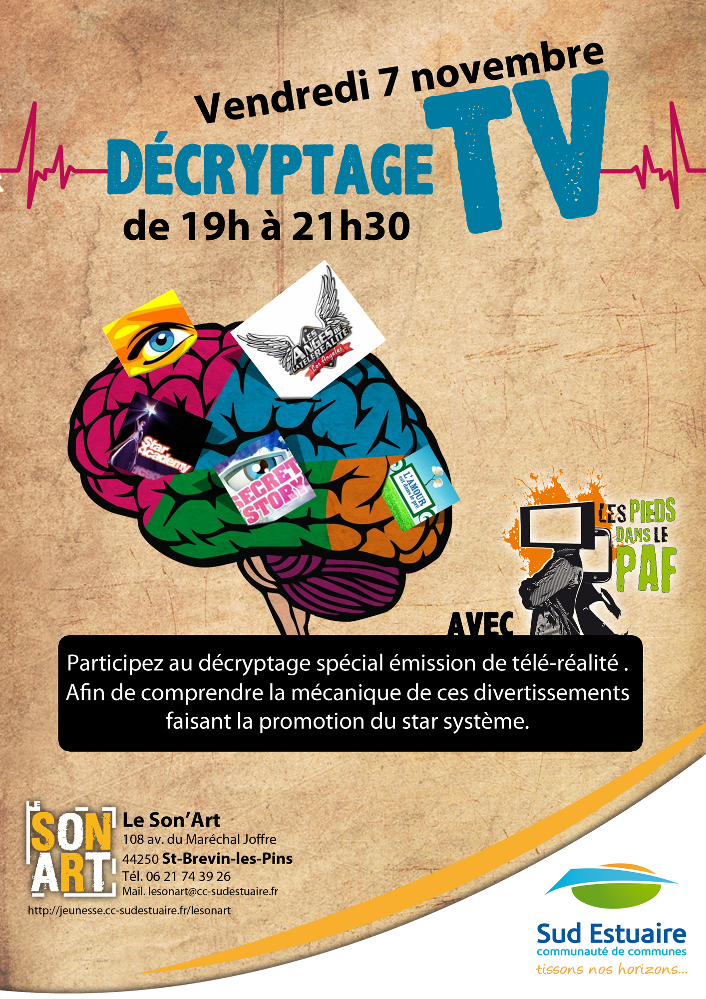 Les soirées du Son’Art proposent régulièrement des temps de rencontres et de débats à la Maison des Jeunes de Saint-Brévin. Le premier vendredi de novembre, les Pieds dans le PAF y proposeront un décryptage autour de la téléréalité.